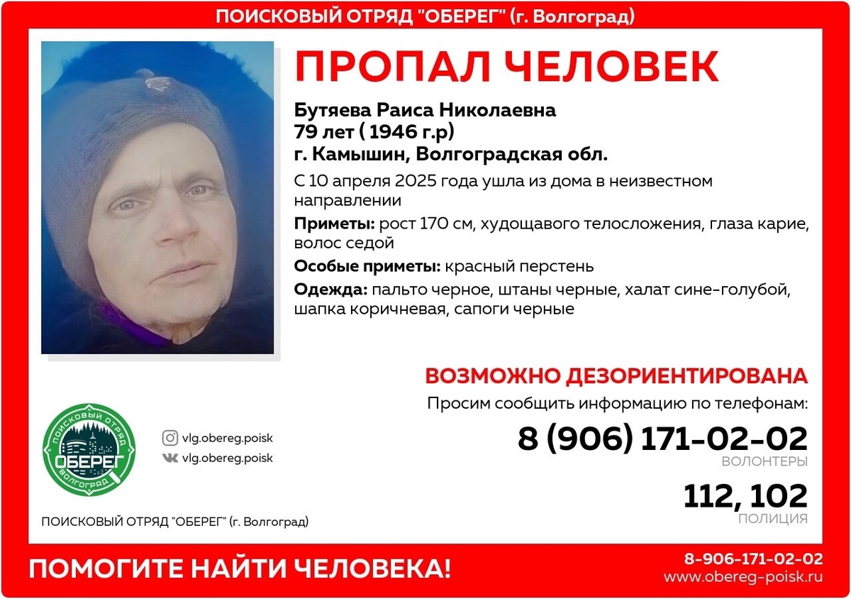 В Волгоградской области третью неделю ищут пропавшую без вести Раису Бутяеву. Поиски объявил отряд «Оберег». 79-летняя женщина ушла из дома в Камышине в неизвестном направлении еще 10 апреля. С тех пор о ней нет никаких известий. 26 апреля был объявлен большой поисковый сбор возле Межмуниципального отдела полиции, волонтеры прочесали все окрестности, но безуспешно. Сейчас в отношении женщины нет никаких зацепок. На данный момент поиски продолжаются, ситуация осложняется тем, что Раиса Николаевна может быть дезориентирована. Также произошло значительное понижение уличной температуры. По словам волонтеров, женщина страдает провалами в памяти, она может подходить к прохожим и задавать вопрос "где её мама и папа". В день исчезновения камышанка была одета в черные пальто и штаны, сине-голубой халат, коричневую шапку и черные сапоги. На руке у нее был красный перстень, а в ушах — серьги с красными камнями. Также в регионе продолжаются поиски 21-летнего Андрея Орлова. Молодой человек бесследн