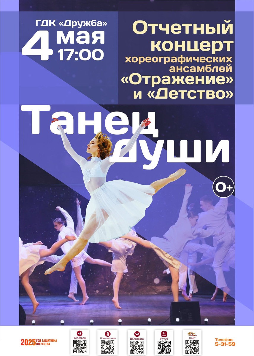 Друзья! Совсем не много времени осталось до отчетного концерта "Танец души" хореографических ансамблей "Отражение" и "Детство". И совсем не много осталось билетов на этот концерт. Мы ни на что не намекаем, но вы еще можете успеть стать счастливыми обладателями билетиков😉 Отчетный концерт "Танец души" состоится 4 мая в 17.00. Билеты доступны по Пушкинской карте! Касса: 8(395-35)-5-31-59. Билеты можно приобрести на сайте ГДК "Дружба"⬇️ https://uigdk.ru/покупка-билетов/?utm_source=telegram&utm_medium=%D0%93%D0%94%D0%9A+%22%D0%94%D0%A0%D0%A3%D0%96%D0%91%D0%90%22+%D0%B3.+%D0%A3%D1%81%D1%82%D1%8C-%D0%98%D0%BB%D0%B8%D0%BC%D1%81%D0%BA&utm_campaign=-1001330736853&utm_term=2025_04_28_14_00&utm_content=349652369