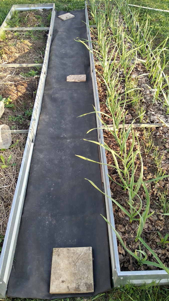 Надоело мне чистить дорожки между грядками. Решила застелить их черным агроволокном. Собиралась это сделать уже несколько лет назад, но то денег на покупку агроволокна жалко было, то времени не хватало, то еще что то мешало. Но в этом году на нашу деревенскую помойку кто то выкинул огромный рулон черного укрывного материала практически нового. Может решили переделать дизайн участка или владельцы сменились и этот материал мешал воплощению их планов . В общем я решила не проходить мимо такого "подарка" и пустить все в дело (в рулоне оказалось 50 м!!!). На участке у нас земля сплошная глина , поэтому грядки у меня стационарные огороженные металлическим каркасом. Подробнее о них я писала ранее в статье https://dzen.ru/a/ZhIyUNhuIy5yvC4n . Проблем по весне с подготовкой грядок к посадке стало в разы меньше, только междурядья меня огорчали. На глине у нас очень активно растет сныть, пырей и осот. Я пыталась засыпать междурядья скошенной травой, щепой от переработки обрезанных веток. Но это не сильно помогало - из под травы и щепы все равно вылезали сорняки, хотя и в меньшем количестве.