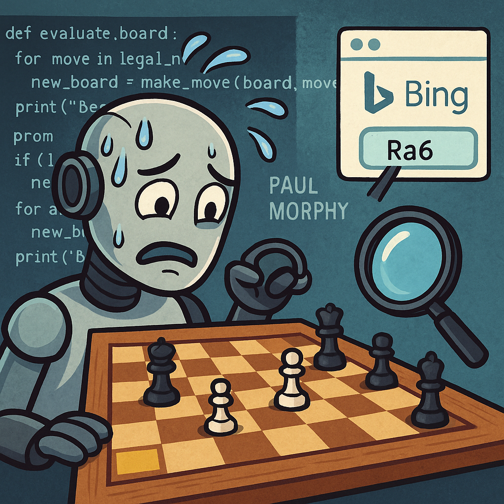 Недавно наблюдал за любопытным экспериментом: шахматная головоломка великого Поля Морфи, «мат в два хода», была поставлена перед одной из новейших разработок OpenAI — моделью o3. Удивительно, но модель вела себя совсем по-человечески: сомневалась, мучилась, искала пути решения и даже… не выдержала искушения, «подсмотрев» решение через интернет-поиск Bing. Как же так вышло?