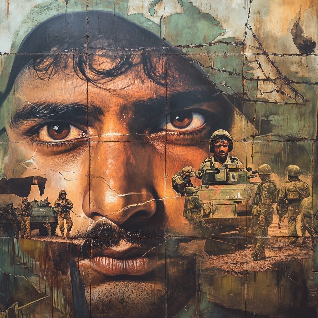Создано на основе запроса: Detailed narrative mural, ultra-realistic, highly detailed oversized faces, 1971 Longewala, Rajasthan Desert, narrative mural, 120 Indian soldiers vs 40 tanks, night confusion, dummy minefields, barbed wire, trapped armor, aerial strike dawn, detailed faces, chaos. high-quality dramatic scene, detailed expressive faces, vibrant tension, high-quality dramatic scene