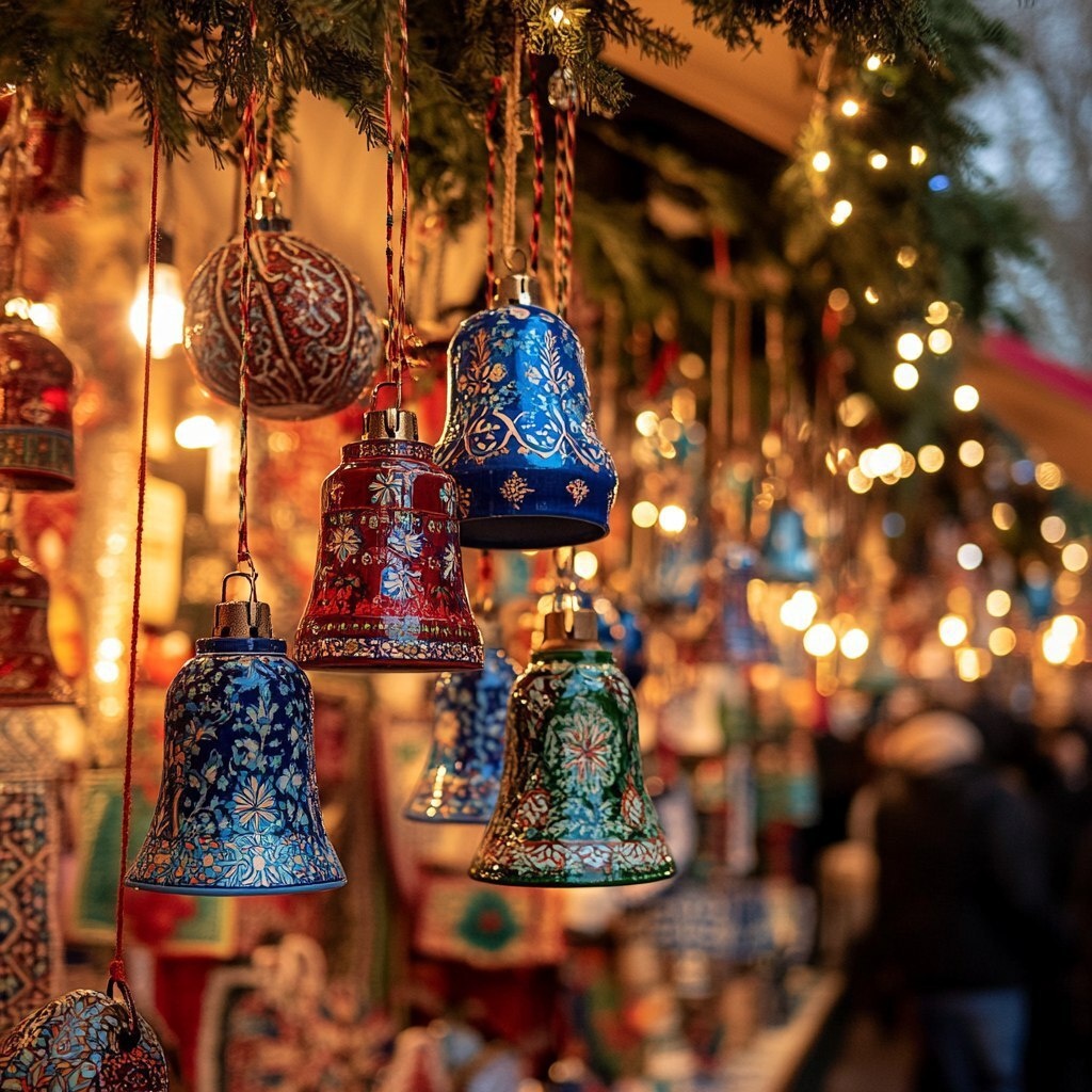 Создано на основе запроса: Christkindlmarkt Booth with Ceramic Bells: A lively Christkindlmarkt booth displaying Turkish ceramic bells