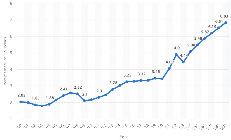 Общие поступления правительства США с 2000 по 2029 год