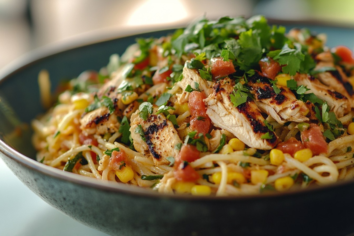 Создано на основе запроса: Title: Mexican Chicken Spaghetti | STYLE: Close-up Shot right view | EMOTION: realistic as possible | SCENE: KEYWORD | TAGS: High-end food photography, clear composition, mouth-watering, indulgent, gourmet, cuisine, recipe | CAMERA: Nikon Z7 | FOCAL LENGHT: soft direction light | PRODUCTION : food stylist | TIME : daytime | LOCATION TYPE : kitchen near windows,
