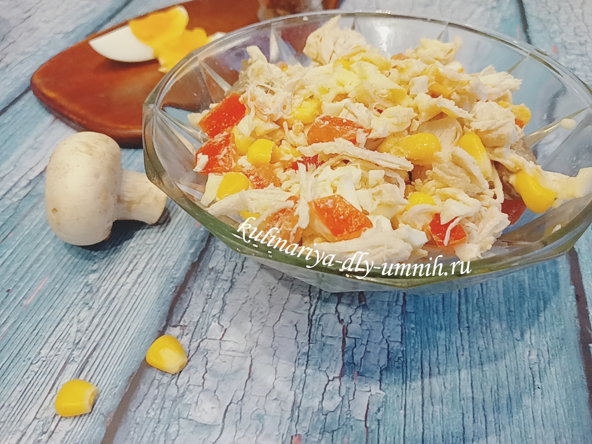 Яркий, сочный, вкусный сборный салат. В составе много белковых ингредиентов, так что салат получился достаточно сытным, на ужин в будний день очень даже неплохо! Нам потребуется Нарезаем куриное филе. Натираем сыр на средней тёрке. Помидор очищаем от семян и сока, нарезаем кубиком, добавляем в салат. Шампиньоны нарезаем пластинками, притушиваем до выпаривания сока. Даем остыть, отправляем в салат. Яйца режем кубиками, тоже в салат. Всыпаем отцеженную кукурузу. Добавляем измельченный чеснок и порезанный лук. Солим, перчим, заправляем майонезом. Перемешиваем , даём охладиться полчаса. Подаем. А у вас что на ужин запланировано? Делитесь идеями!