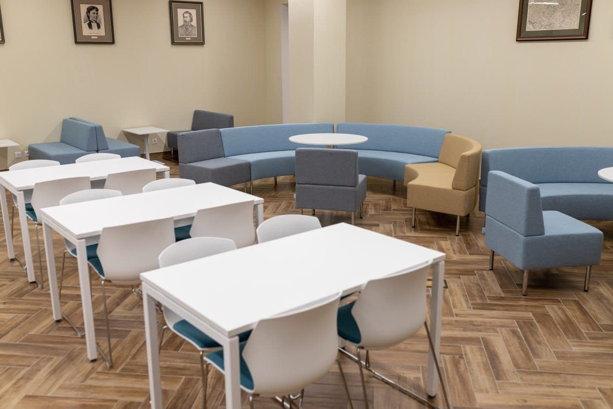 Требовалось создать многофункциональное помещение, в котором мебель легко было бы трансформировать под разные форматы работы для групп от 3 до 20 человек. Польская мебель ISKU идеально соответствовала этим требованиям.