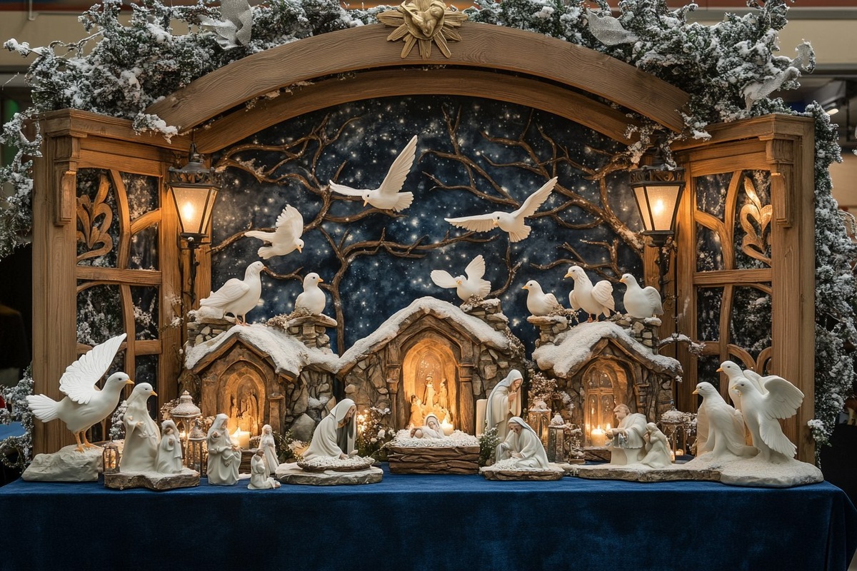 Создано на основе запроса: Christkindlmarkt Booth with Nativity Displays: A serene Christkindlmarkt booth displaying resin nativity scenes and stained-glass pieces on a blue velvet table, lit by candle lanterns. The booth has a wooden arch with white doves, set against a snowy SLC backdrop, using deep navy (#0D47A1) and soft gray (#B0BEC5) tones, creating a sacred holiday atmosphere. --- Автоперевод: Стенд Крайсткиндлмаркта с рождением дисплеев: безмятежная кабинка Christkindlmarkt, демонстрирующая сцены рождества смола и витражные кусочки на синем бархатном столе, освещенном фонарями свечей. Необычно выглядит? 🤔 https://dzen.ru/id/65c0c65c86e4f837c27b24d7 #ИИ #AI #нейросеть #midjourney #art