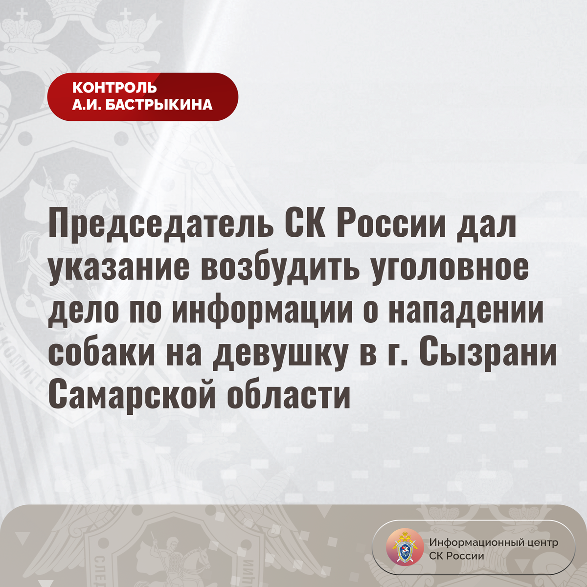 Председатель СК России дал указание возбудить уголовное дело по информации о нападении собаки на девушку в г. Сызрани Самарской области В социальной сети сообщается, что 25 апреля текущего года в городе Сызрани Самарской области собака бойцовой породы, находясь на самовыгуле без намордника, набросилась на 19-летнюю местную жительницу. Пострадавшей потребовалась медицинская помощь. Отмечается, что данный случай не единичный, ранее эта собака нападала на местных жителей. В СУ СК России по Самарской области по данному факту организована процессуальная проверка. Председатель Следственного комитета Российской Федерации Александр Иванович Бастрыкин дал указание и.о. руководителя СУ СК России по Самарской области Александру Владимировичу Воеводину возбудить уголовное дело и представить доклад о ходе и результатах его расследования. Исполнение поручения поставлено на контроль в центральном аппарате ведомства. #СледственныйКомитет #СКРоссии #СКР #ИЦСКР #ИнформационныйЦентр #АлександрБастрыкин #
