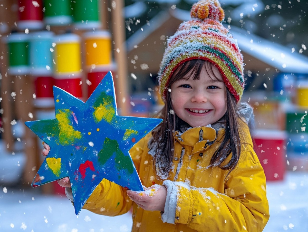 Создано на основе запроса: Child with a Painted Ornament: A child holding a painted wooden star ornament in blue and yellow, smiling at the