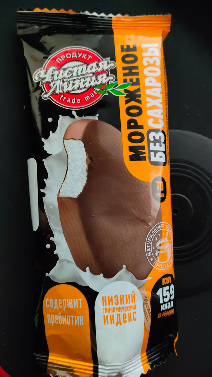 Хотелось бы сказать, что ценник в 120 рублей слишком высок, но в нынешних реалиях все мороженое стоит очень дорого. Данный продукт показался мне очень интересным, так как он не содержит сахара, а в составе есть пребиотик. Второе кстати для меня играет большую роль, так как иногда наблюдаю у себя признаки плохого усвоения лактозы, поэтому молочные продукты употребляю в меру. Раньше в обычных магазинах я не натыкался на мороженное без сахара, куплен данный экземпляр был в магазине "Дикси". По составу сразу видим, что сахарозу заменили на фруктозу, по калорийности мороженое нельзя считать диетическим. Продукт с растительным жиром, что по ценнику в магазине нельзя понять, они все одного цвета и в одной куче, так ещё и перемещены так, что нельзя понять, что к чему относится. Как на мой взгляд тает он быстрее обычного эскимо с сахаром, но это не точное наблюдение, просто я брал два разных и это чисто сравнение на ходу. Глазурь конечно плотная, ее много, но вкус оставляет желать лучшего, кра