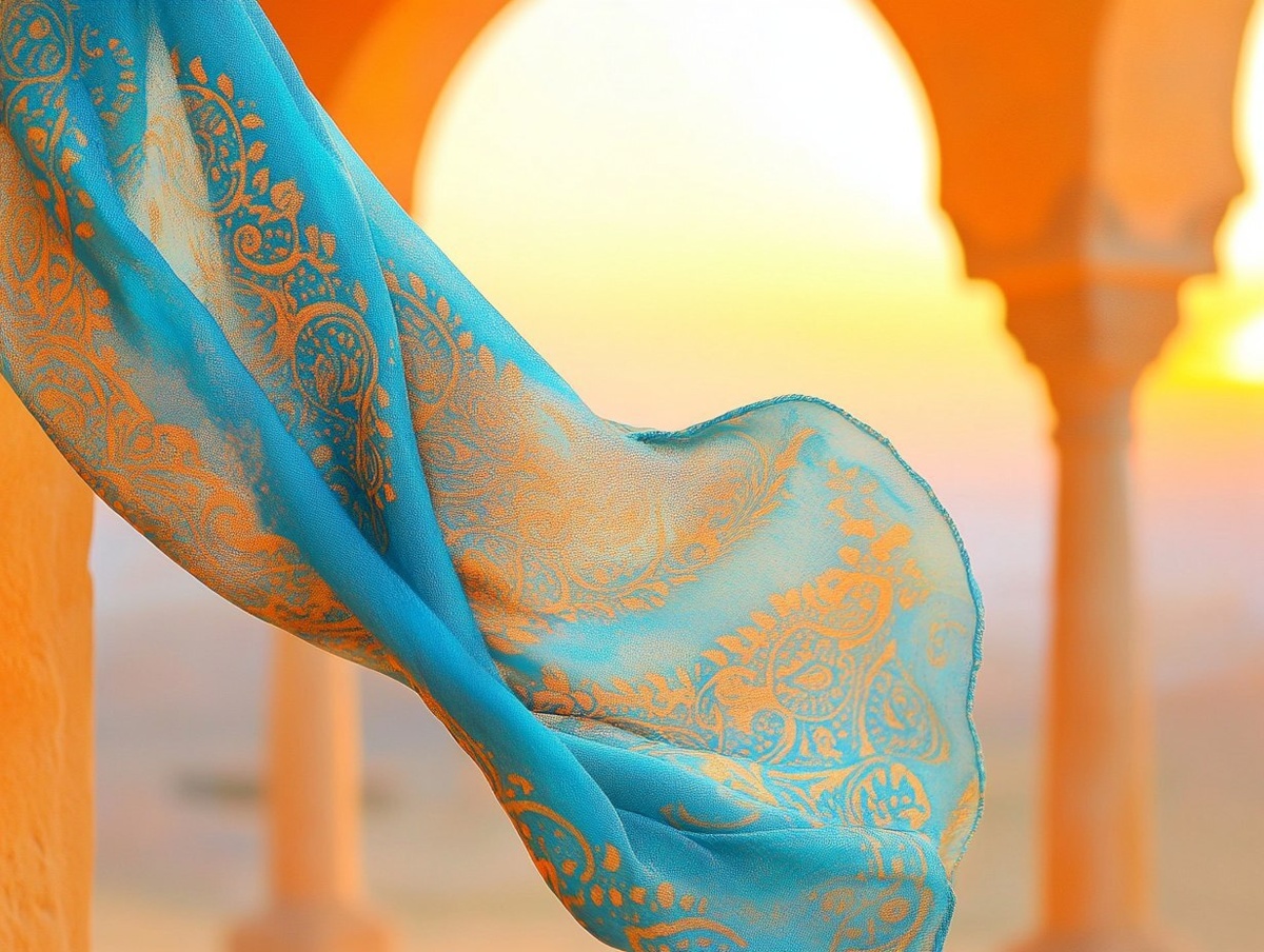 Создано на основе запроса: Scarf in a Desert Breeze: A close-up of a bohemian scarf in turquoise blue (#26C6DA) with paisley patterns, billowing in a desert breeze, set against a Moroccan archway with a sunset sky, using saffron orange (#FF8F00) and sand beige (#F5F5DC) tones, capturing the wanderlust spirit.