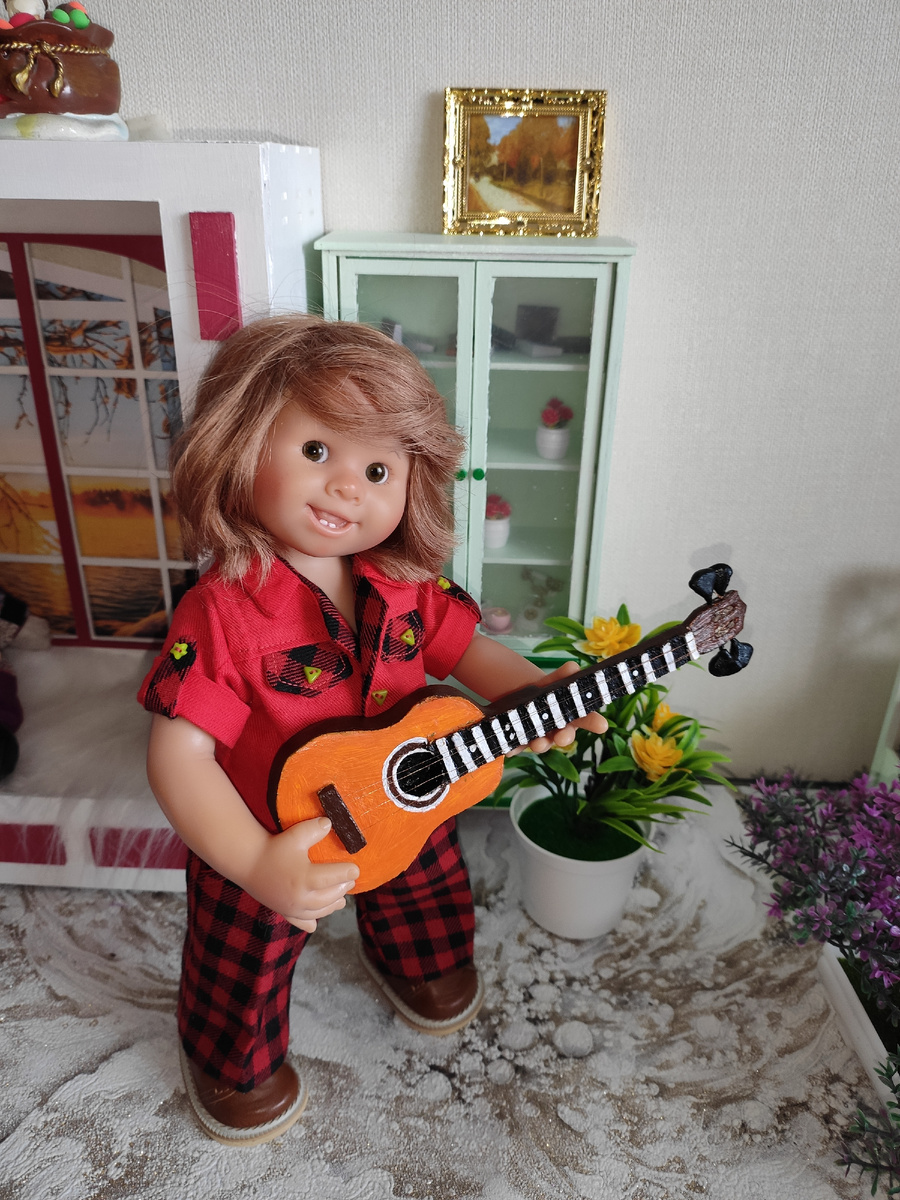 А ведь уже давно сделала и покрасила, а вот закрутилась с огородом и выпустила ее из виду. Зато у меня радость, я убрала весь свой огород 15 соток, уффф, устала пока убирала, но к цветению черёмухи и вишни успела. Так что теперь будем фоткаться в красоте. Завтра утром заедет дочь, едет с Кемерово в Питер и заедет к нам на денек, а вечером уже поедет домой. Так и болтается из Питера в Кемерово и обратно. Оказывается в Питере не так то просто найти работу. Да, про гитару хотела. Барри вам сейчас споет на гитаре: А Ириска села поближе, тоже слушает братика. Ну а я пошла шить платья с цветочками, неделя прошла, а ничего не сшито, покажу на этой неделе с цветочками, все равно у меня с грибочками ничего нет. Пока-пока.