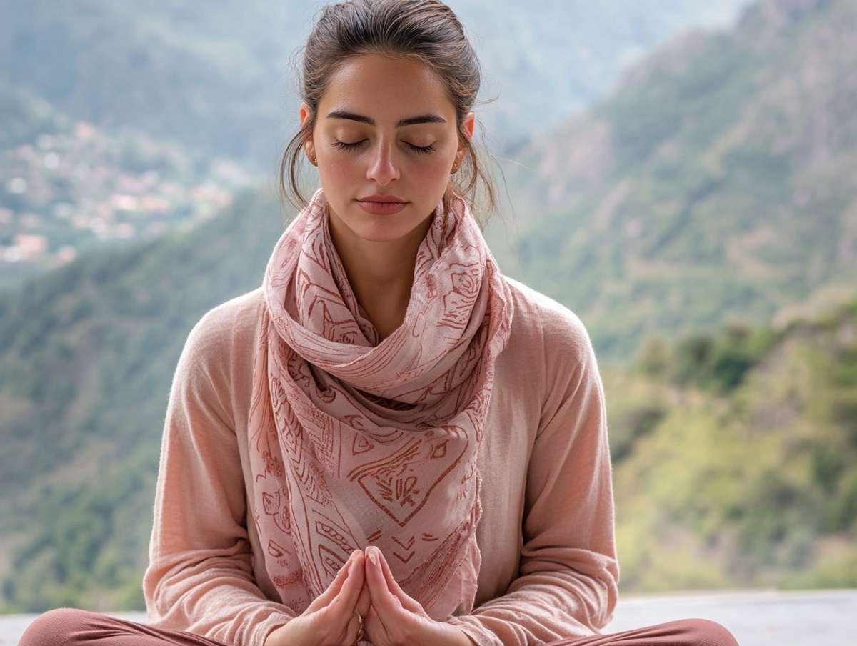 Создано на основе запроса: Scarf on a Yoga Retreat: A woman wearing a dusty rose (#D81B60) scarf with geometric patterns, meditating at a