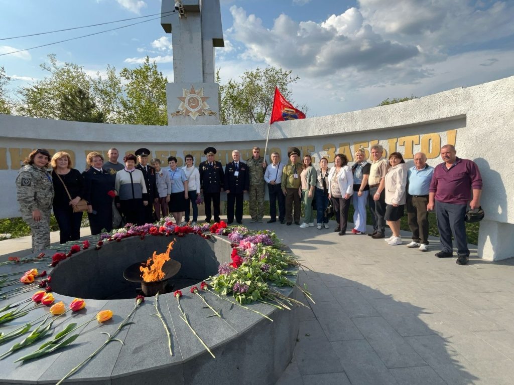 Собравшиеся возложили цветы у Вечного огня и почтили память павших героев и погибших мирных жителей минутой