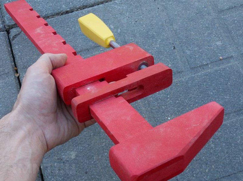 В качестве рамы для струбцины можно использовать как твёрдую древесину, так и металлопрокат. Уголки или профильные трубы хорошо подойдут, но их нужно тщательнейшим образом зачистить, прогрунтовать и покрасить, чтобы на готовом изделии не оставалось следов ржавчины. Чтобы исключить случайное механическое повреждение или продавливание соединяемых деталей, рекомендуется поверх металлических элементов струбцины наклеивать деревянные планки или натягивать распущенный силиконовый шланг.