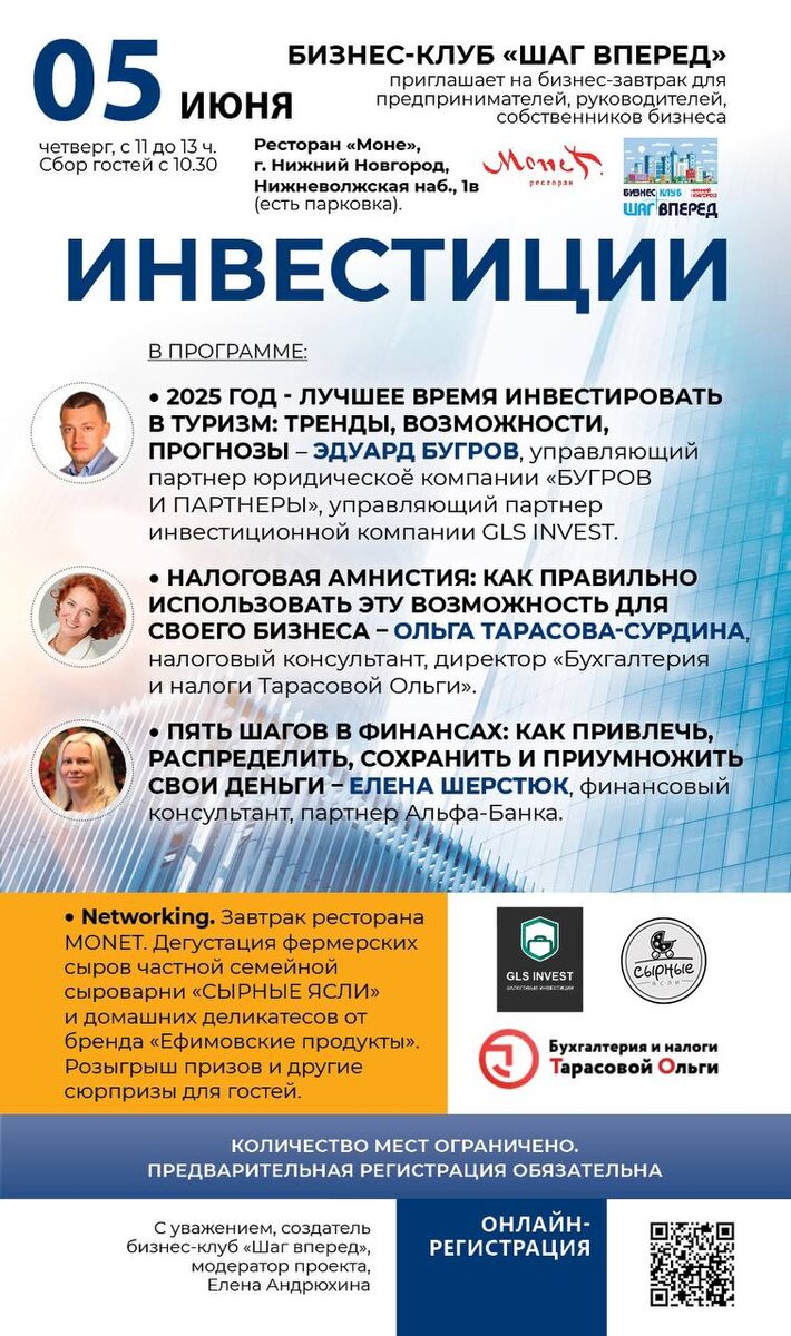 Бизнес-клуб «Шаг вперед» приглашает на бизнес-завтрак для предпринимателей, руководителей, собственников бизнеса.👍⤵️ 📌5 июня 2025г, четверг, с 11 до 13 ч. Сбор гостей с 10.30 📍ресторан «Моне», г. Нижний Новгород, Нижневолжская наб., 1в (есть своя парковка). ➡️тема: ИНВЕСТИЦИИ ➡️В ПРОГРАММЕ: ✅2025 ГОД - ЛУЧШЕЕ ВРЕМЯ ИНВЕСТИРОВАТЬ В ТУРИЗМ: ТРЕНДЫ, ВОЗМОЖНОСТИ, ПРОГНОЗЫ – (Эдуард Бугров) , управляющий партнер юридическоӗ компании «БУГРОВ И ПАРТНЕРЫ», управляющий партнер инвестиционной компании GLS INVEST. ✅ НАЛОГОВАЯ АМНИСТИЯ: КАК ПРАВИЛЬНО ИСПОЛЬЗОВАТЬ ЭТУ ВОЗМОЖНОСТЬ ДЛЯ СВОЕГО БИЗНЕСА – @olga_t_s (Ольга Тарасова-Сурдина) , налоговый консультант, директор «Бухгалтерия и налоги Тарасовой Ольги». ✅ПЯТЬ ШАГОВ В ФИНАНСАХ: КАК ПРИВЛЕЧЬ, РАСПРЕДЕЛИТЬ, СОХРАНИТЬ И ПРИУМНОЖИТЬ СВОИ ДЕНЬГИ – @AlyoAlyoAlyona7 ЕЛЕНА ШЕРСТЮК, финансовый консультант, партнер Альфа-Банка. ✅Networking. Завтрак ресторана MONET. Дегустация фермерских сыров частной семейной сыроварни «СЫРНЫЕ ЯСЛИ» Ирина Филип