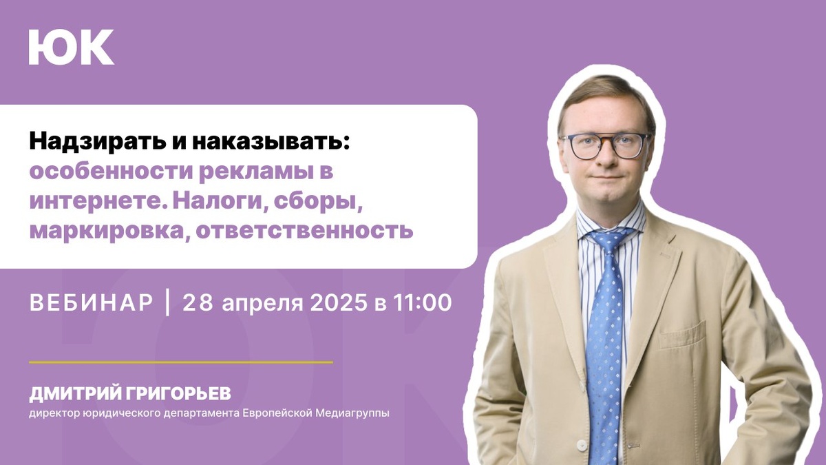 ✔️ Дмитрий Григорьев, директор юридического департамента Европейской Медиагруппы, на вебинаре расскажет про жесткий контроль за интернет-рекламой: обязательные сборы, верификация страниц, реформа рекламы финуслуг и новые штрафы. Спикер разберет, как применять новые правила, чтобы компанию не оштрафовали.