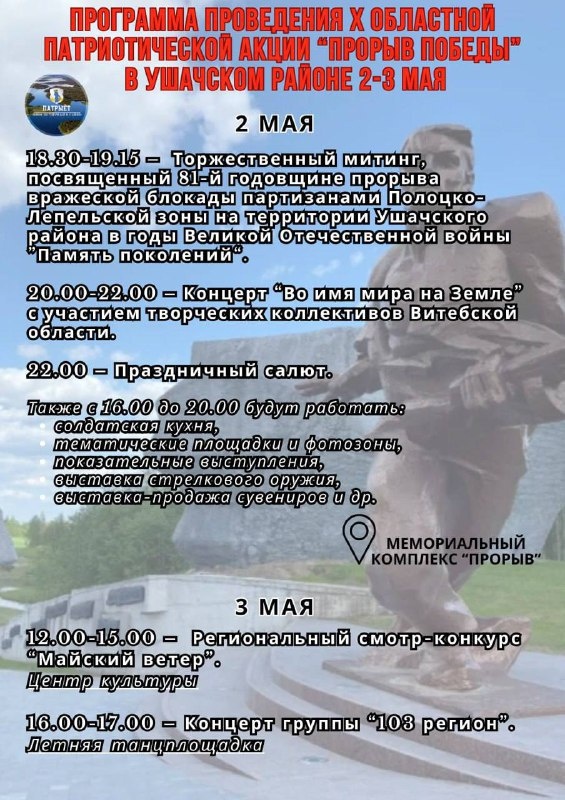 ⭐️Стала известна программа областной патриотической акции "Прорыв Победы", которая пройдёт в Ушачском районе 2-3 мая