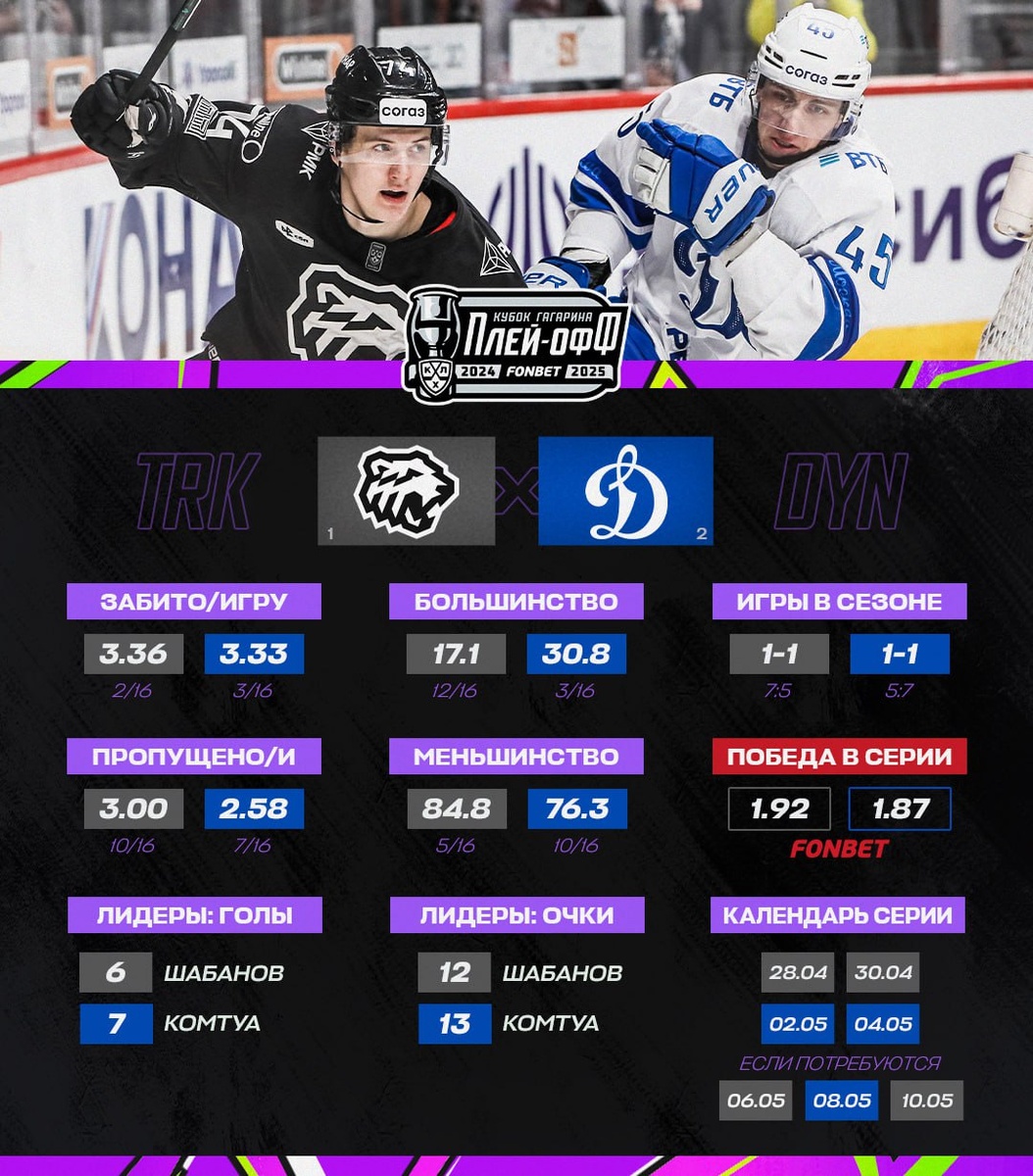 🚜🔵 Прошлой весной челябинцы буквально вынесли бело-голубых в четырёх матчах, но сейчас это уже не имеет никакого значения — и «Трактор», и «Динамо» стали сильнее, чем год назад, поэтому и пересекаются они не в четвертьфинале, а стадией позже. 🏆#КубокГагарина