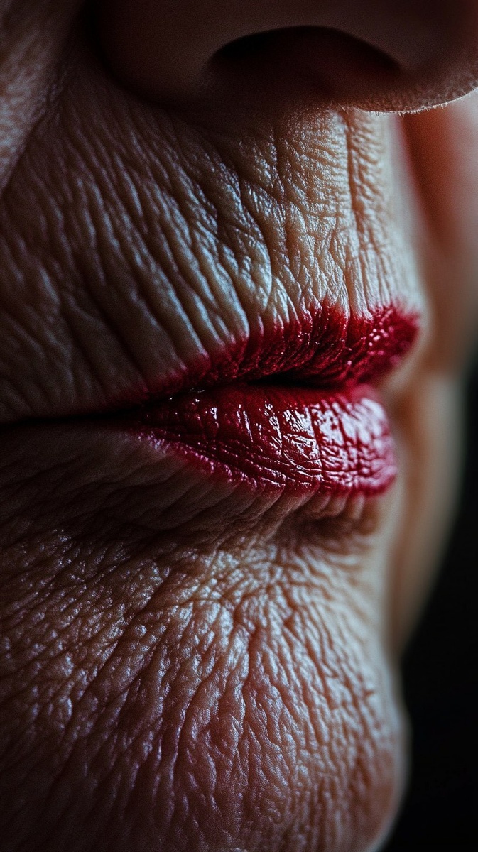 Создано на основе запроса: close-up of an old woman's lips, wrinkled and textured skin, subtle lipstick remnants, natural aging lines, realistic skin pores, soft lighting, hyper-realistic style, detailed, high definition, macro photography