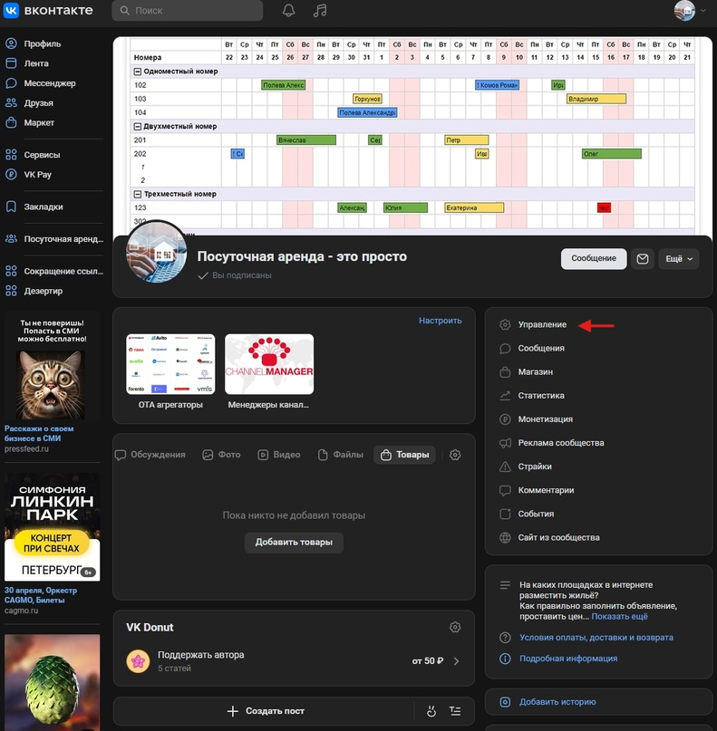 в веб-версии в приложении В сообществе появится раздел Магазин Выполните первоначальную настройку магазина Можно выбрать расширенные или базовые настройки магазина Различаются они настройками отображения товара, в базовой версии нет возможности включить уведомления. Для посуточной аренды более подходят базовые настройки Можно указать номер телефона, по которому гость сможет с вами созвониться Добавьте информацию о предоплате, как к вам добраться, условиях возврата предоплаты. После настройки добавьте объекты аренды Можно загрузить до 5 фото и 1 видео. Добавьте большую сумму в поле Старая цена и товар будет отображаться со значком скидки Если у вас много вариантов товара, можно объединить их в подборки по каким-то признакам После добавления товаров они будут отображаться в сообществе