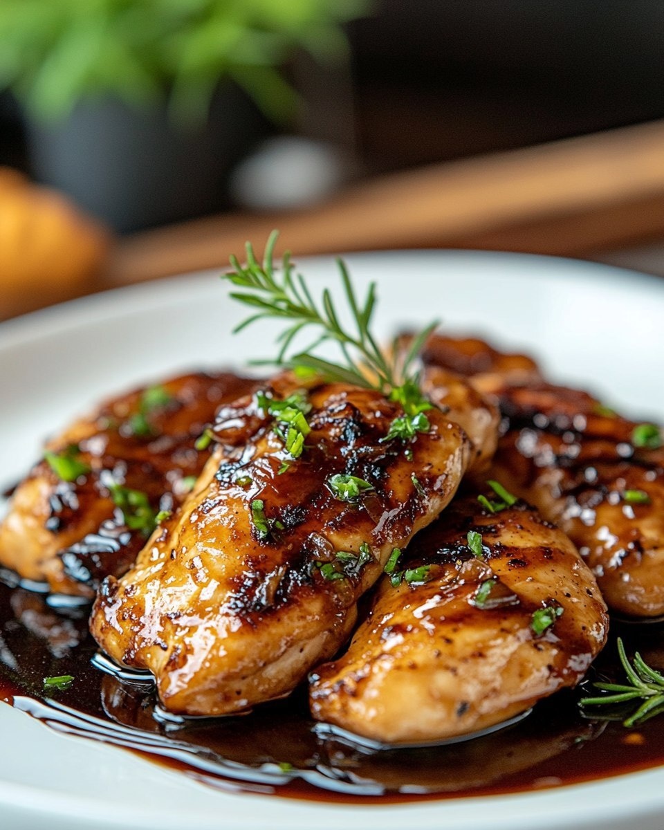 Создано на основе запроса: Title: Balsamic Chicken | Close-up Shot right view, taken by a photographer with a high quality camera, served on a white plate, background of kitchen, very tasty, delicious, homemade, without any text, words or writing