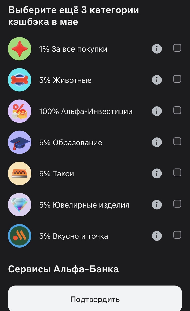 Сейчас у меня уже 3 карты с возможностью выбора категорий. Больше пока не завожу, а сбер и не считаю, не нравится мне их политика со спасибо. Начну с альфы, так как он один из первых выставляет категории на выбор. Мне он предложил следующее: Для меня актуальных категорий нет. видимо выберу ювелирку, образование и вкусно и точка. Остальное все мимо. Барабан выдал 2% на продукты. Годно, но у ОТП банка 3%, что выгоднее. За этот банк я сильно переживала, так как его карту заказала только в прошлом месяце, а уже в мае должна была меняться политика кэшбека. Но когда я заглянула в выбор, то успокоилась. Выбрать нужные мне 5% на ЖКХ и 3% на супермаркеты можно. И ещё остается 2 категории на выбор. Внимание привлекли «аптеки и мед услуги» именно за вторую часть, но в мае к врачам я уже не планирую, поэтому думаю выбирать не буду. Думаю, мне нужнее «АЗС» и «Кафе и рестораны». Последнее насколько актуально будет пока не знаю, но пусть так. Одежда вроде не нужна. Тут категории появляются то