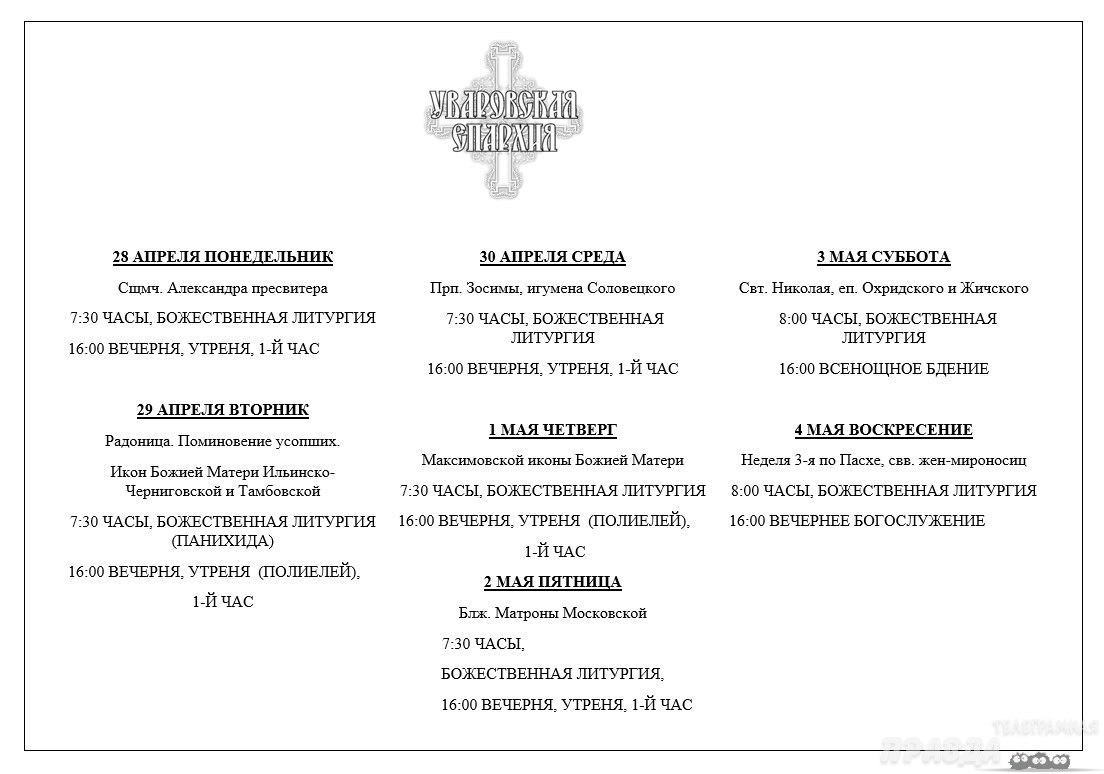Расписание Богослужений в Христорождественском кафедральном соборе города Уварово с 28 апреля по 4 мая