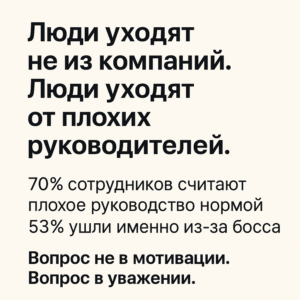 Хорошая команда начинается с хорошего руководства. Исследование Bad Boss Index 2025 подтверждает то, что многие давно ощущали на практике: больше половины сотрудников признают, что причиной их увольнения стал именно руководитель, а не компания. Ключевые выводы исследования: Причины ухода: Даже высокие зарплаты и престижные условия не компенсируют токсичное руководство: Вопрос в аудиторию: