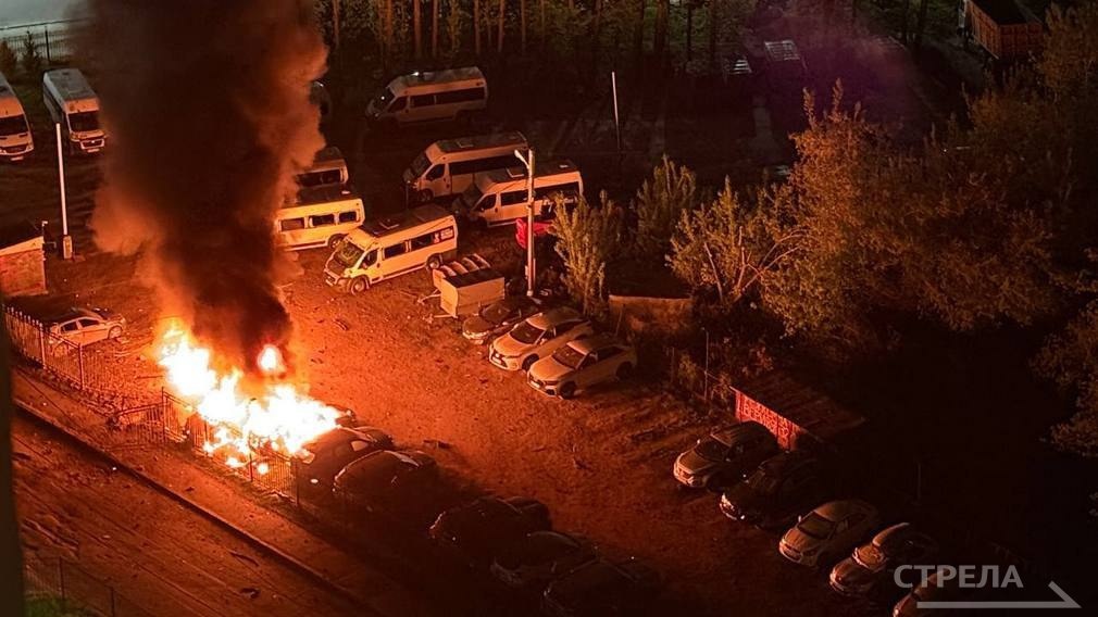🔺Пожар начался после массированной атаки БпЛА. Свидетелем происшествия стал корреспондент РИА «Стрела». Также некоторые легковушки посекло осколками.