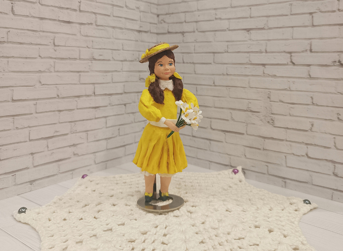 Платьице потребовало длительной работы, поскольку в работе была хлопковая вата. А она ведет себя капризно - после просушки пришлось выравнивать поверхность еще пару раз, чтобы сгладить неровности и вмятины, образующиеся после высыхания материала.
