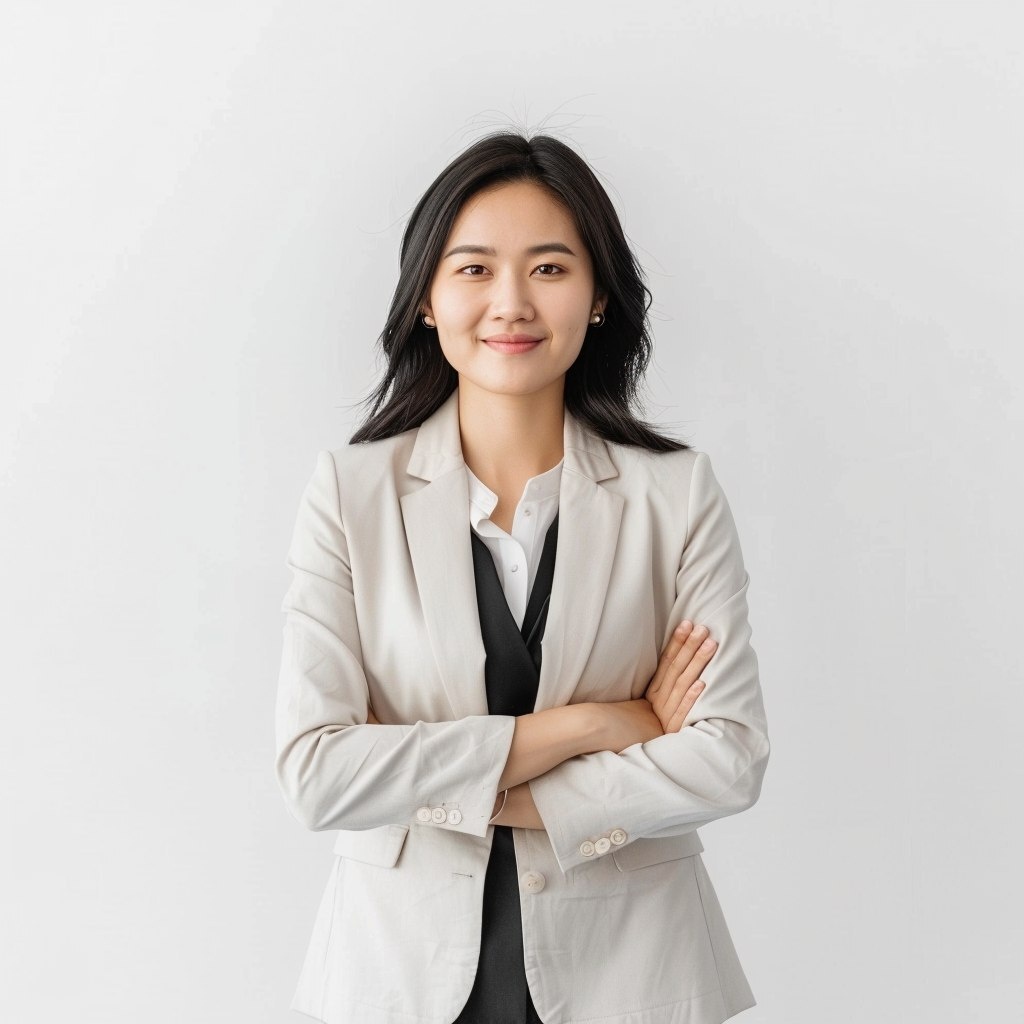 Создано на основе запроса: Professional woman happily standing confidently in the center,white minimalist clean background,soft studio