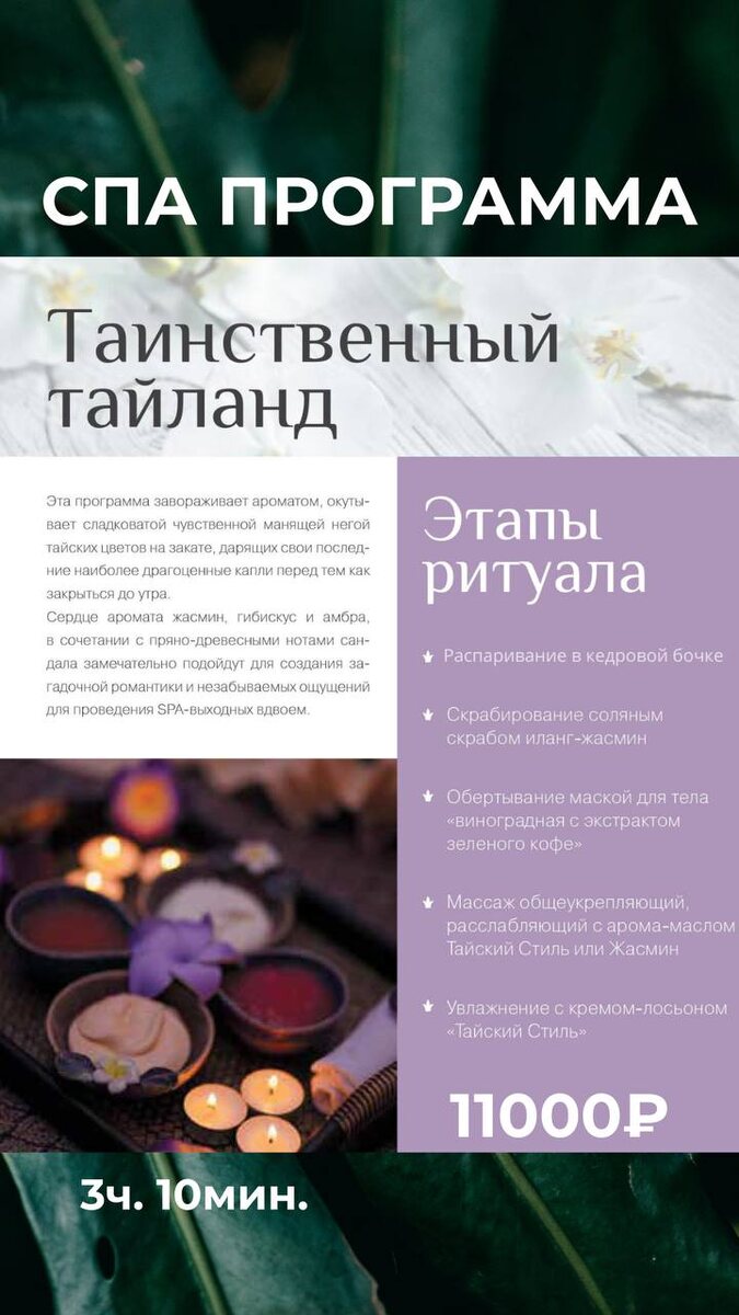 СПА ПРОГРАММА Таинственный Тайланд 🌺✨ Эта программа завораживает ароматом и окутывает сладковатой чувственной тайской романтикой! 🌅 Цветы на закате дарят свои драгоценные капли, создавая волшебную атмосферу для незабываемых СПА-выходных вдвоем. 💕 Сердце аромата 🌸 Жасмин, гибискус и амбра в сочетании с пряно-древесными нотами сандала создают загадочное настроение. Этапы ритуала 🌈 1. Распаривание в кедровой бочке ♨️ 2. Скрабирование соляным скрабом иланг-жасмин 🌊 3. Обертывание маской для тела «Виноградная с экстрактом зеленого кофе» 🍇 4. Массаж общеукрепляющий, расслабляющий с арома-маслом Тайский Стиль или Жасмин 💆♀️ 5. Увлажнение с кремом-лосьоном «Тайский Стиль» 🧴 Погрузитесь в атмосферу Тайланда и подарите себе и своему любимому незабываемые ощущения! 🌟🌺 https://n960947.yclients.com ✨Новотушинская 3