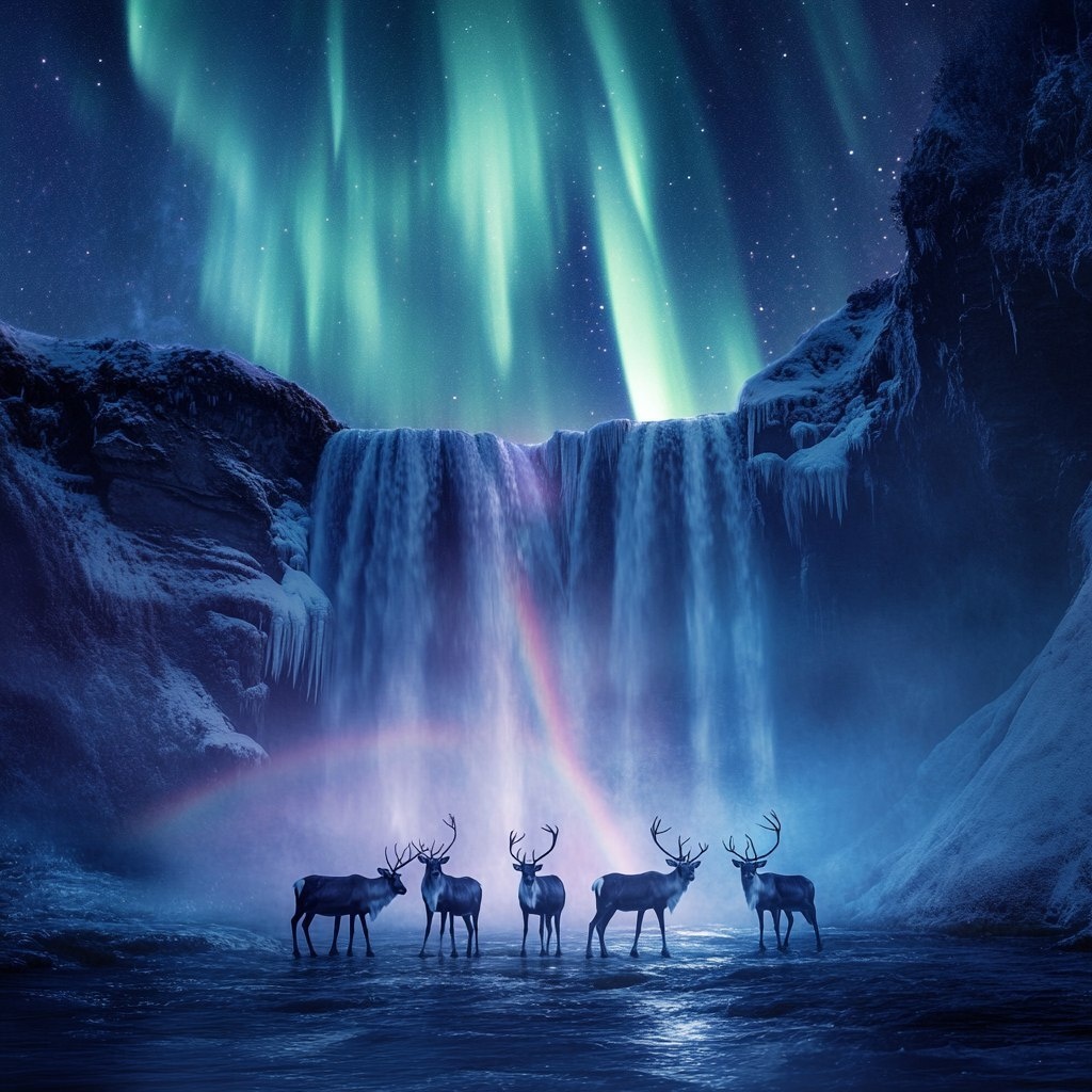 Создано на основе запроса: cinematic, ultra-realistic, a herd of wild reindeer stands in glowing mist before a massive, thundering waterfall at night. Two vivid rainbows arc through the waterfall’s spray, while vibrant green and purple aurora borealis swirl across the starry sky. Soft moonlight highlights antlers and mist, high-end camera, sharp focus, National Geographic style, masterpiece