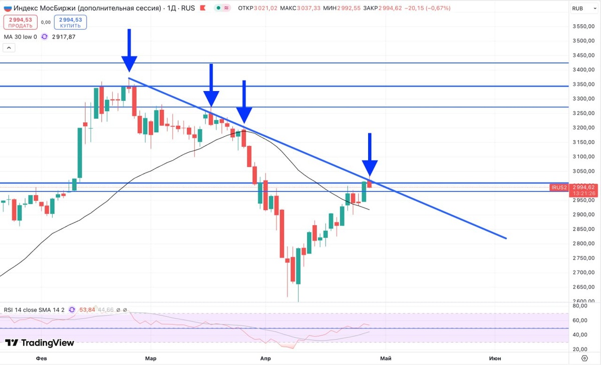 Наш рынок дошёл до прежней наклонной линии сопротивления и логично отваливается от неё 🤔