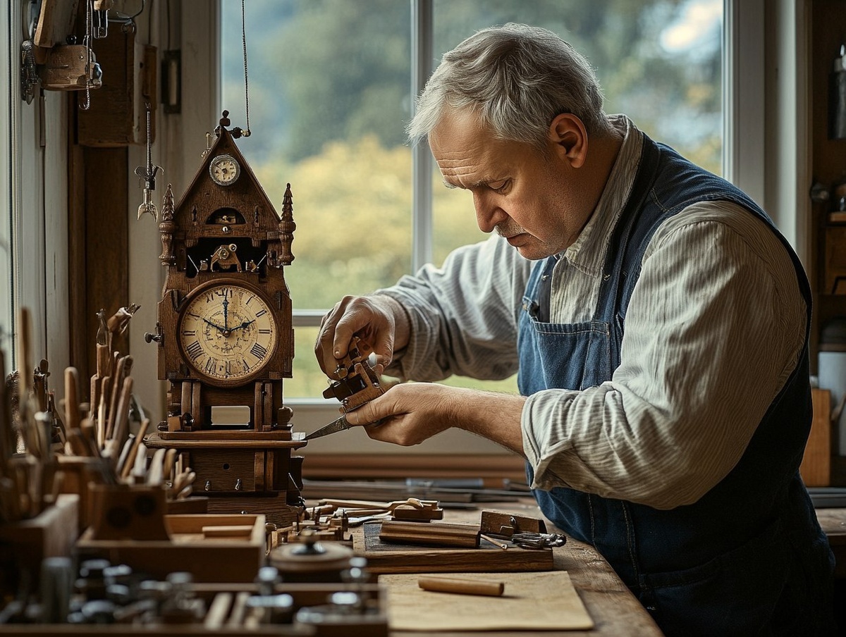 Создано на основе запроса: Clockmaker Assembling a Clock: A 48-year-old male clockmaker assembling a cuckoo clock in a Triberg workshop