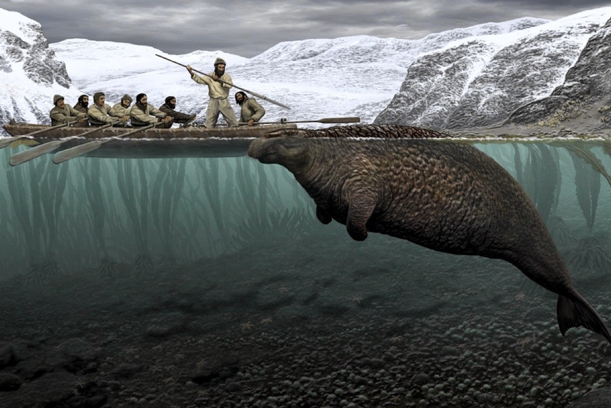 Огромное морское млекопитающее весом до 10 тонн, открытое исследователем Георгом Стеллером в середине XVIII века у берегов Командорских островов. Эти безобидные травоядные существа напоминали современных ламантинов, но были гораздо больше. Всего за 27 лет после открытия стеллеровы коровы были полностью истреблены охотниками из-за мяса и шкуры.