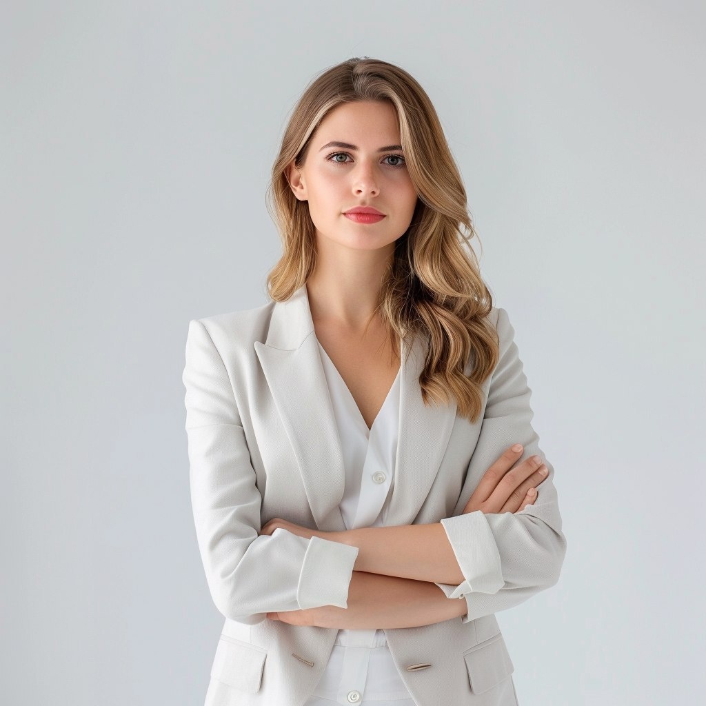 Создано на основе запроса: Professional woman standing confidently in the center,white minimalist clean background,soft studio lighting