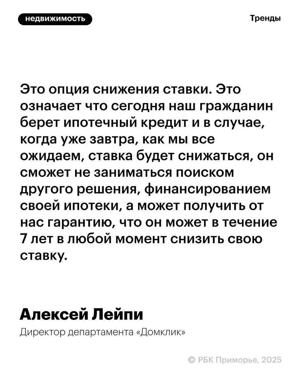 💬 На минувшей неделе во Владивостоке впервые прошла конференция Domclick Digital Day для представителей рынка недвижимости Как отметил председатель Дальневосточного Сбербанка Андрей Черкашин, на конференции обсудили не только и не сколько ипотеку, «а все сервисы, которые нужны жителям, застройщикам для комплексного решения задач». В частности, в декабре Сбербанк внедрил опцию — гарантию снижения ипотечной ставки в любой момент в течение 7 лет. Директор департамента «Домклик» Алексей Лейпи пояснил, что в случае если ЦБ понизит ключевую ставку ипотечные заемщики смогут изменить условие договора согласно срокам, предусмотренным гарантией банка. 🍱Подписывайтесь на РБК Восток