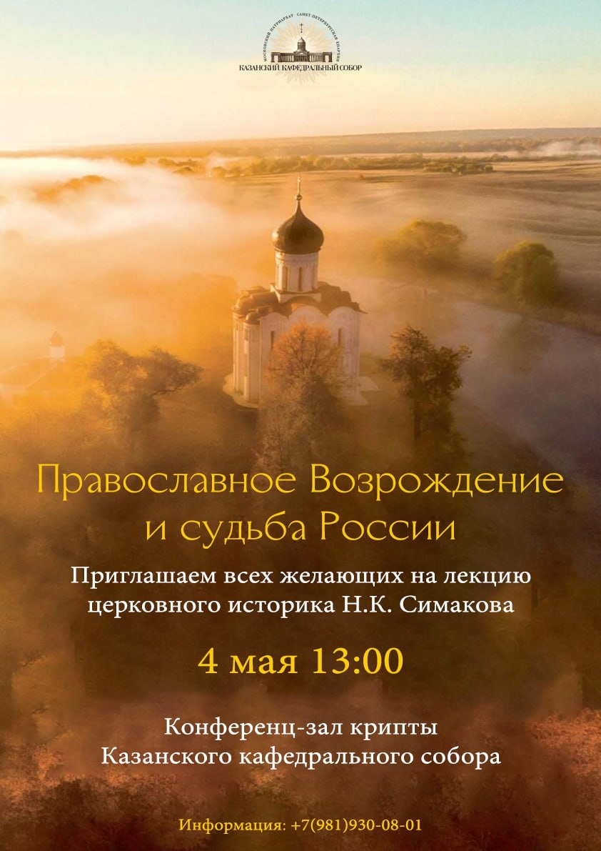 Приглашаем всех желающих 4 мая в 13:00 в конференц-зал крипты Казанского кафедрального собора на лекцию "Православное Возрождение и судьба России", которую проведет церковный историк и публицист Николай Кузьмич Симаков. ✅ Вход свободный. ⠀ Проход в крипту осуществляется через служебную парковку собора со стороны Казанской улицы или через кафе "Крипта" со стороны набережной канала Грибоедова. ⠀ ☎️Справки по телефону +7(981)930-08-01