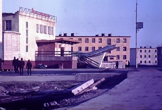 – Совсем по-другому смотрится Дом Офицеров в летнее время, никаких сугробов вокруг и снежных горок. На наружных стенах никакой снежной бахромы и даже виден их бледно-розовый цвет. Сколько вокруг открытого свободного пространства, бетонное покрытие вместо снежного наста, полная свобода для «променадов». Часы на столбе как бы подтверждают, что в этом месте бывает много людей и даже можно назначать встречи под часами. Хорошо виден и памятник-самолёт МиГ-19, серебристый и почти блестящий. С бортовым красным номером «01».