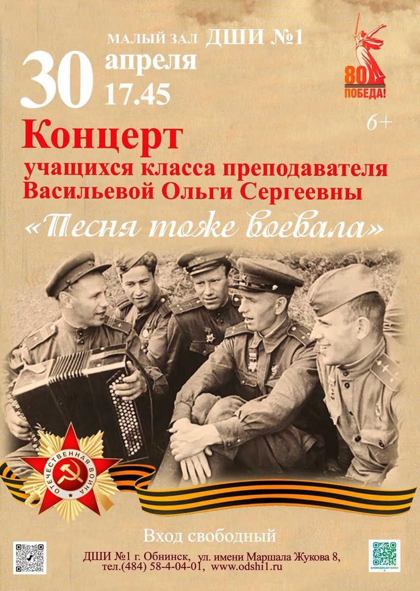 🎶30 апреля в 17:45 в малом зале ДШИ №1 в Обнинске состоится концерт класса Васильевой О.С. «Песня тоже воевала», посвящённый празднованию 80-летия Победы в Великой Отечественной войне. Вход свободный. Обнинск, ул. Маршала Жукова, 8. 👍 Подписаться | Прислать мероприятие