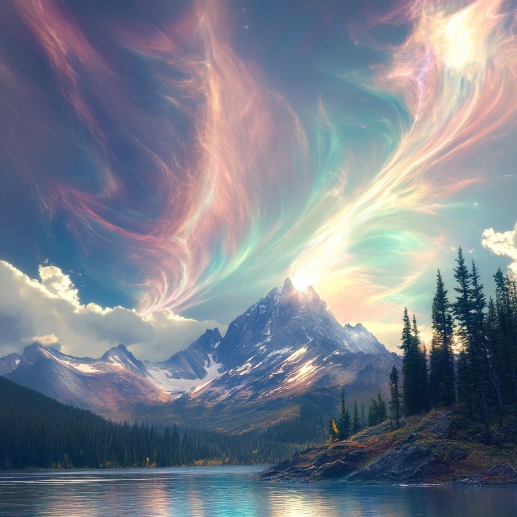 Создано на основе запроса: beautiful mountain scene with mystical energy swirling in the sky, universal consciousness, healing energy