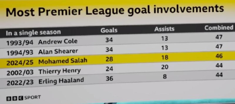 Мохамед Салах идет на рекорд по системе гол+пас за один сезон Премьер-Лиги. Сейчас у нападающего "Ливерпуля" уже 46 результативных действий ☝️