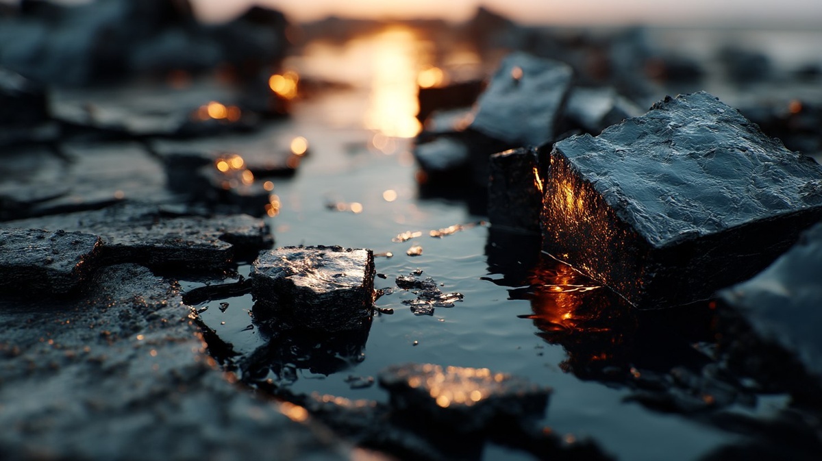 Создано на основе запроса: A cinematic close-up of thick black crude oil spilled across cracked desert earth, reflecting soft natural light