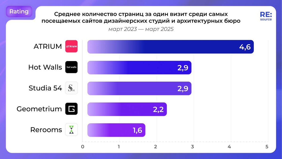 🔹🔹🔹 Среди студий дизайна интерьера и архитектурных бюро самый самый залипательный сайт у ATRIUM Об этом говорят цифры: количество страниц за один визит у этого сайта почти в два раза больше, чем у его ближайших конкурентов. Наша гипотеза: интерактивная заставка, которая встречает пользователя на сайте, задает тон всей коммуникации и мотивирует человека изучить больше страниц. А для дизайнерских студий и архитектурных бюро важно, чтобы аудитория увидела как можно больше проектов/кейсов из портфолио. Поэтому количество просмотренных страниц на сайте — важный показатель, влияющий на уровень заинтересованности клиентов и будущие продажи. Тоже хотите узнать, у кого из ваших конкурентов на сайте сидят дольше, а у кого долго не задерживаются? Это можно сделать с помощью выгрузки трафика, которую мы делаем всего за 9 900₽. Читайте подробности тут. Рейтинги сайтов из других сфер: 🚘Кто в каршеринге собирает больше всего реферального трафика? 💻У какого диджитал-агентства больше всего т