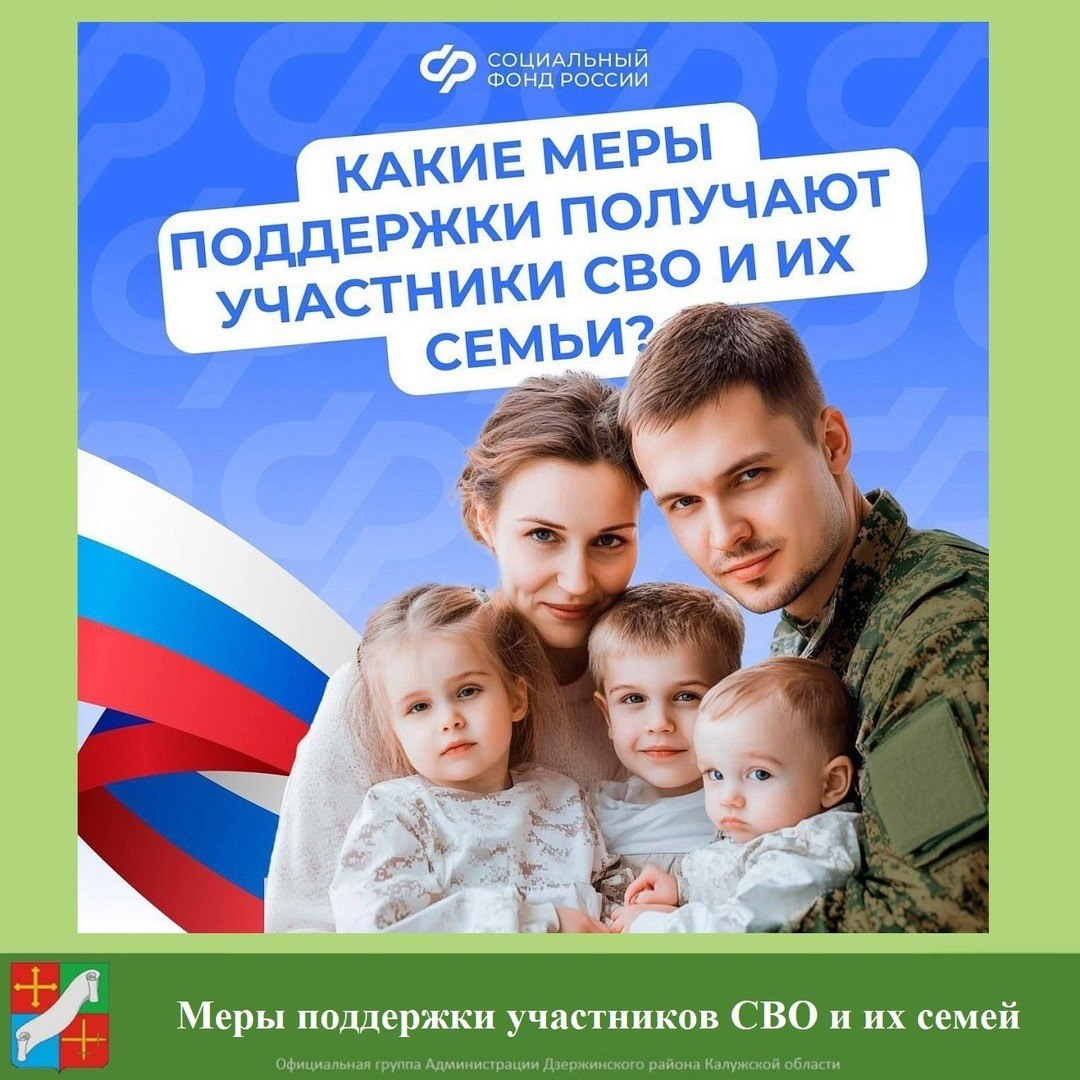 Поддержка участников СВО и их семей - важная задача государства: действует система мер социальной поддержки. Участникам СВО Отделением СФР по Калужской области могут быть назначены: 1. ежемесячная денежная выплата (ЕДВ) ветеранам боевых действий; 2. ежемесячная выплата Героям России; 3. ежемесячная денежная компенсация набора социальных услуг; 4. ежемесячная денежная компенсация по военной травме; 5. дополнительное ежемесячное материальное обеспечение по военной травме. Семьям защитников Отечества также положены льготы и меры поддержки, в т.ч.: - единое пособие (выплата назначается без учета доходов мобилизованного военнослужащего); - единовременная выплата беременной жене мобилизованного военнослужащего; - ежемесячное пособие на ребенка мобилизованного военнослужащего; - льготное оформление ежемесячного пособия на первого ребенка до 3 лет мобилизованного военнослужащего и проч. ❗Подробнее обо всех льготах читайте на сайте Социального фонда. (sfr.gov.ru/grazhdanam...)