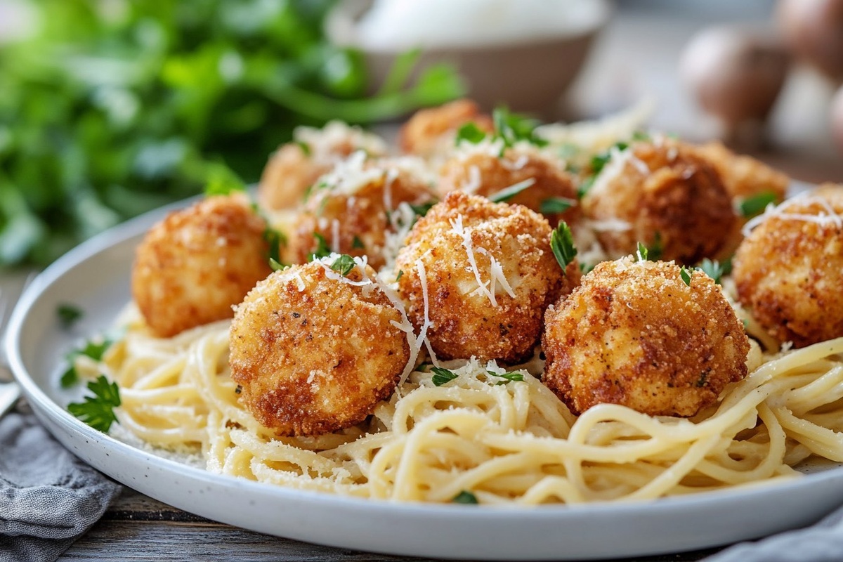 Создано на основе запроса: Title: Garlic Butter Chicken Bites with Creamy Parmesan Pasta | STYLE: Close-up Shot right view | EMOTION