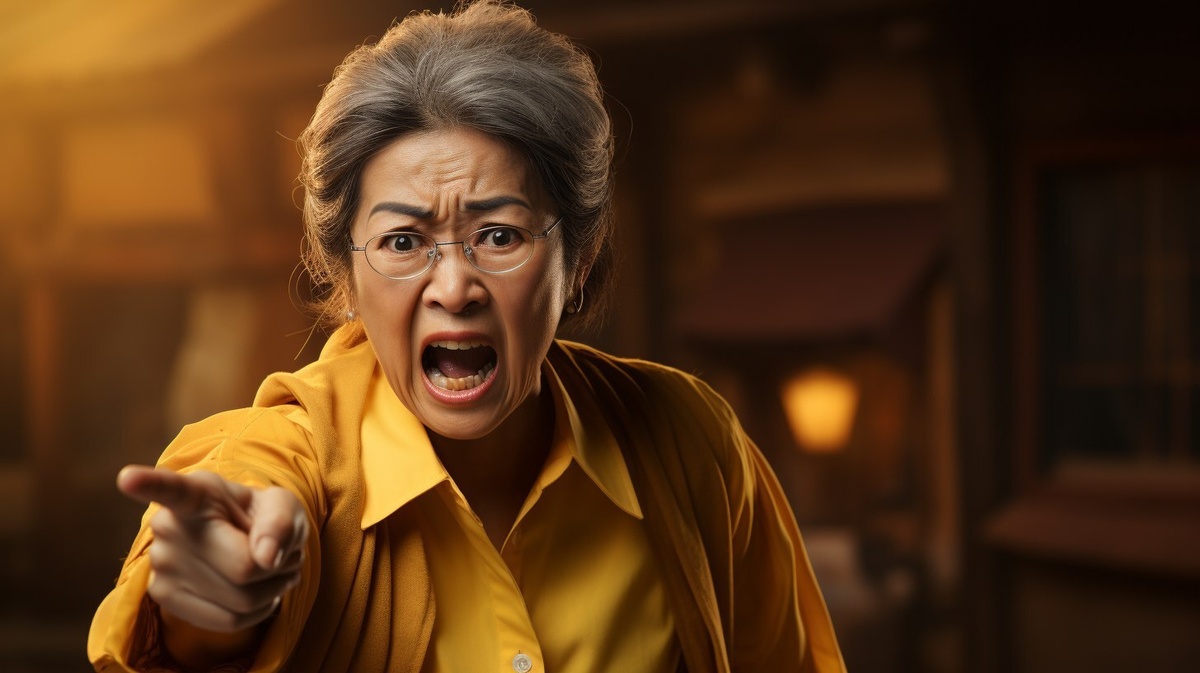 Создано на основе запроса: A wide panoramic photorealistic scene of a mad Malaysian auntie (around 40 years old) with a yellow PLAIN