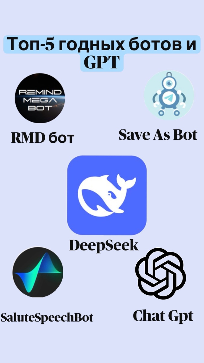 Всем привет! Наш список открывает конечно же ИИ, который произвел фурор в свое время 1)DeepSeek Главное для чего я пользуюсь им это извлечение краткой информации из файлов, картинок. При правильных написанной задаче, данный gpt сможет стать вашим другом, ЖЕСТКИМ надзирателем или даже психологом! 2)Save As Bot Скачает видео по ссылки из любых источников (Pinterest, TikTok, instagram) вместе со всеми звуками отправит вам с возможностью скачать ❤️ 3)Chat gpt Создаст для вас любую картинку, преобразит фото, сделает ретушь, но бывает долго думает 4)RemindMegaBot Иногда нам проще вспомнить нашу задачу по сообщению, чем записать куда-то. Можно выставлять время, писать кучу напоминалок и он всегда отправит (Успеваешь сделать больше, нужно отчитаться так же, напомнить позже или выполнено, иначе пришлет ещё) 5)SaluteSpeech Bot Из видеосообщения/голосового сделает текст, огромный плюс-можно добавить прямо в группу и он будет расшифровать все сообщения Друзья, все эти роботы конечно хороши, но н